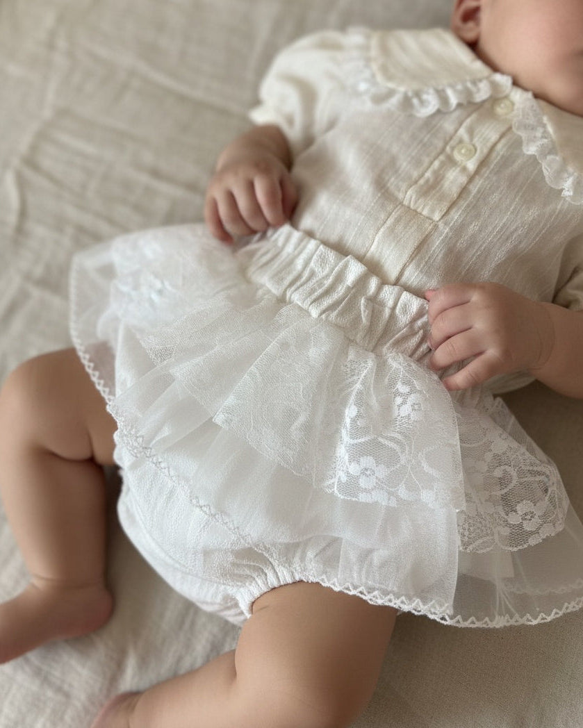 Deze bloomer is perfect voor speciale gelegenheden, maar ook prachtig als dagelijks setje in combinatie met een blouse. Stijl haar af met de Genevieve blouse in crème of wit, de Hailey blouse of de Madelynn blouse voor een verfijnde en romantische outfit.